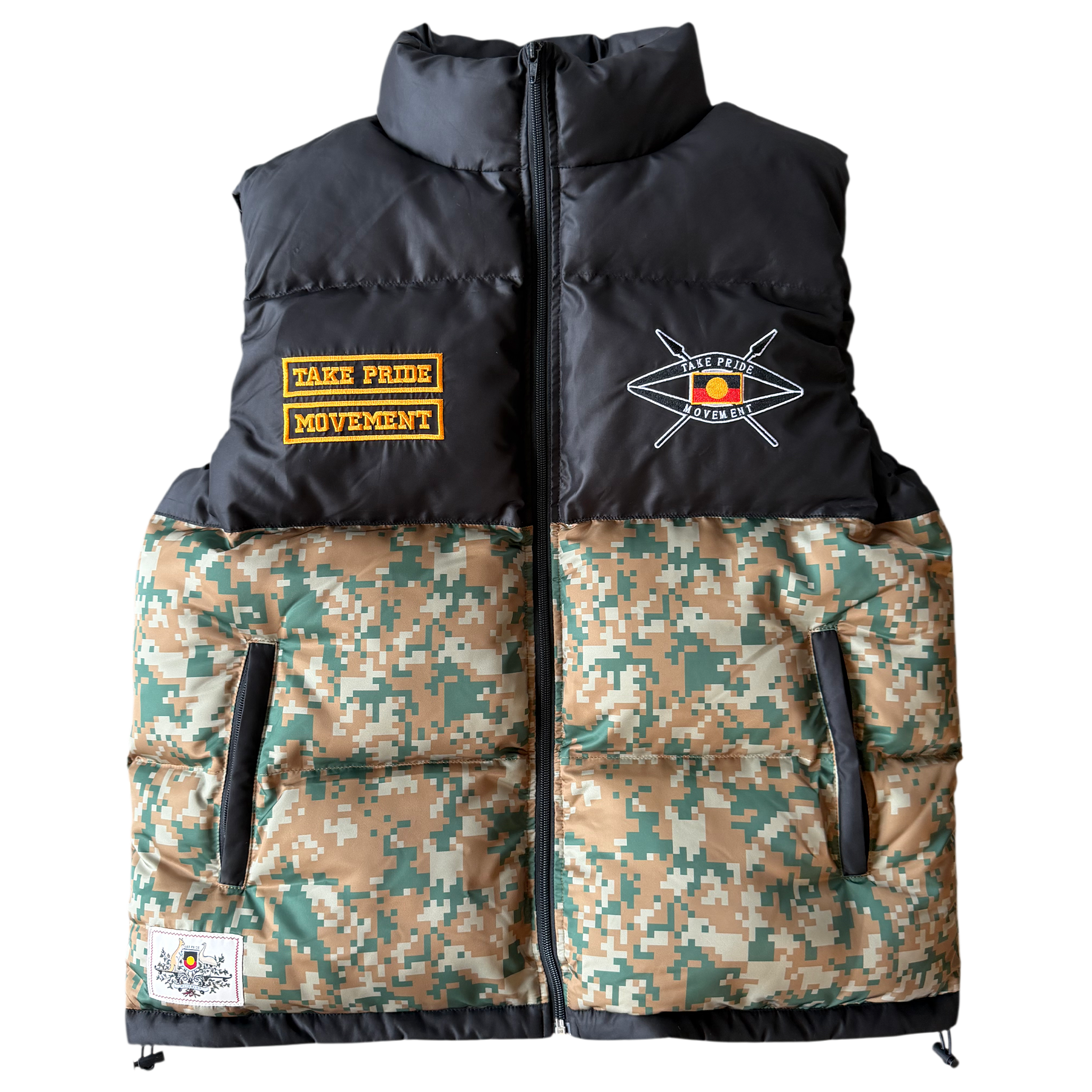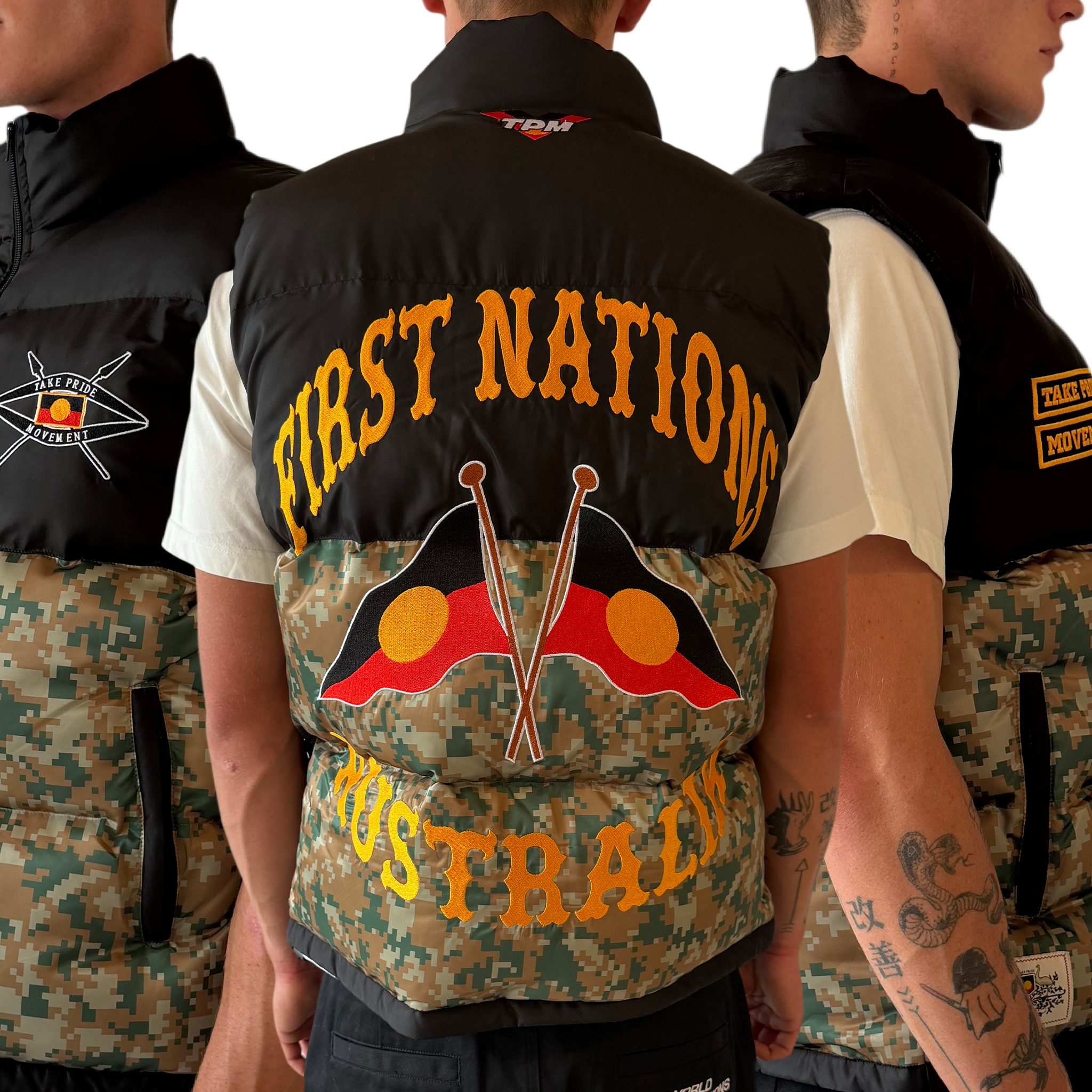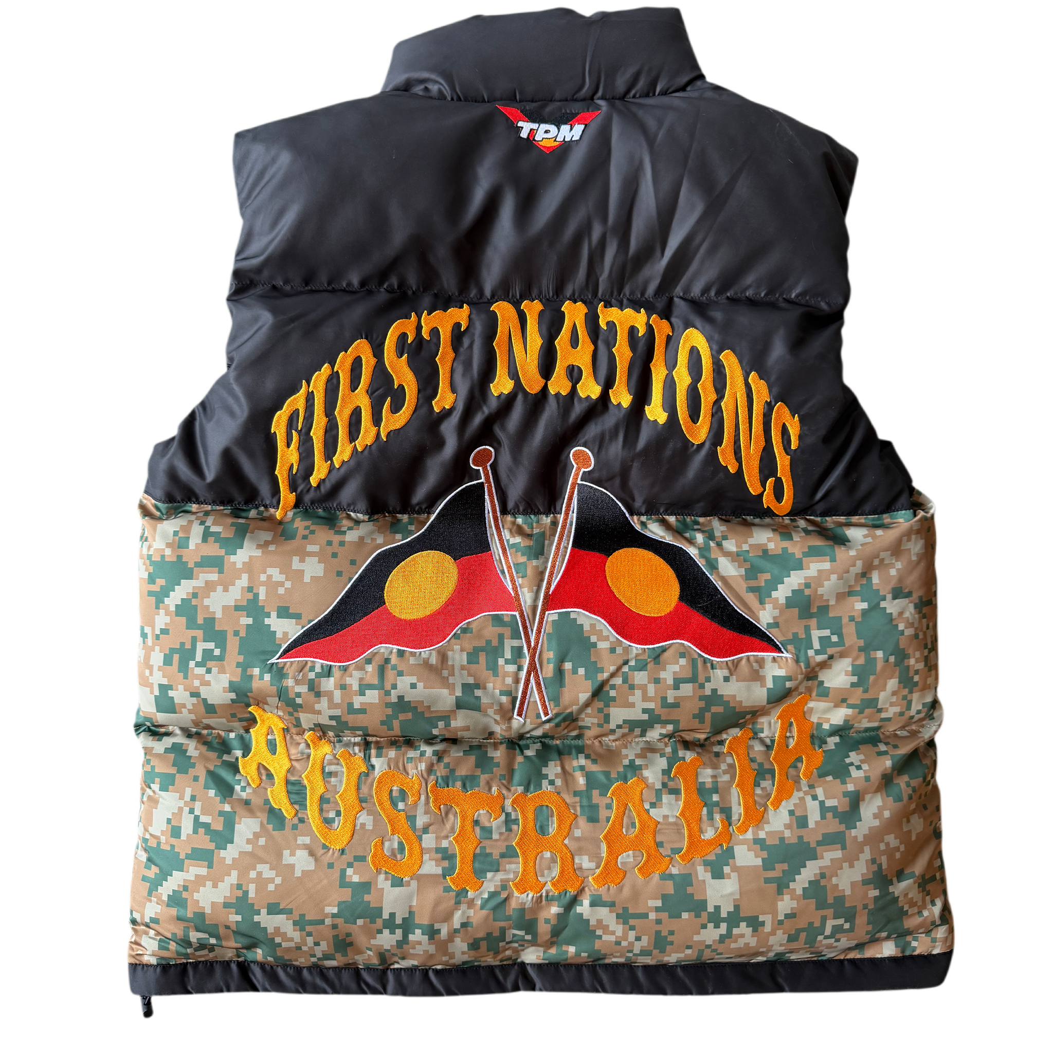 Underneath, crossed Aboriginal flags sitting strong across the camo panel.