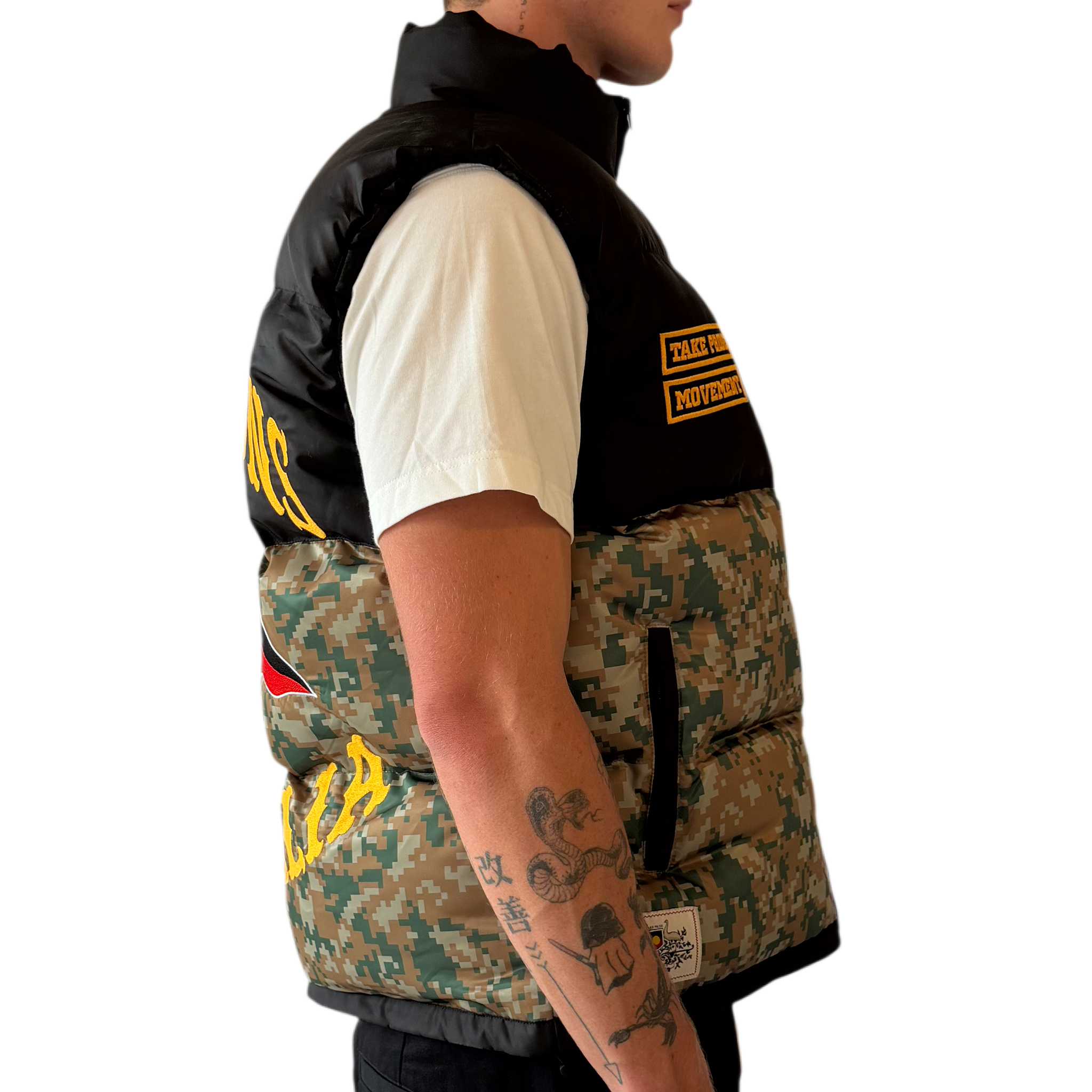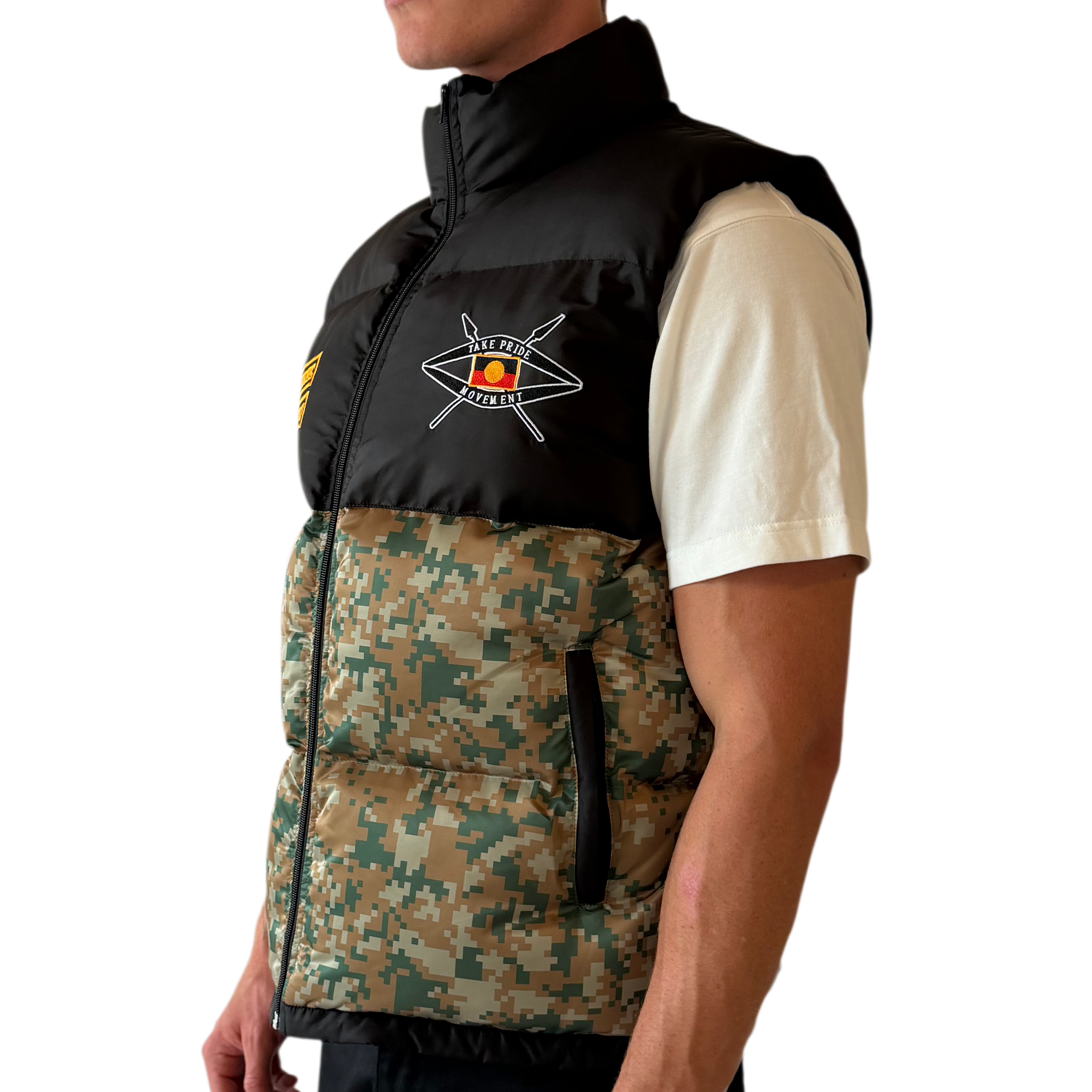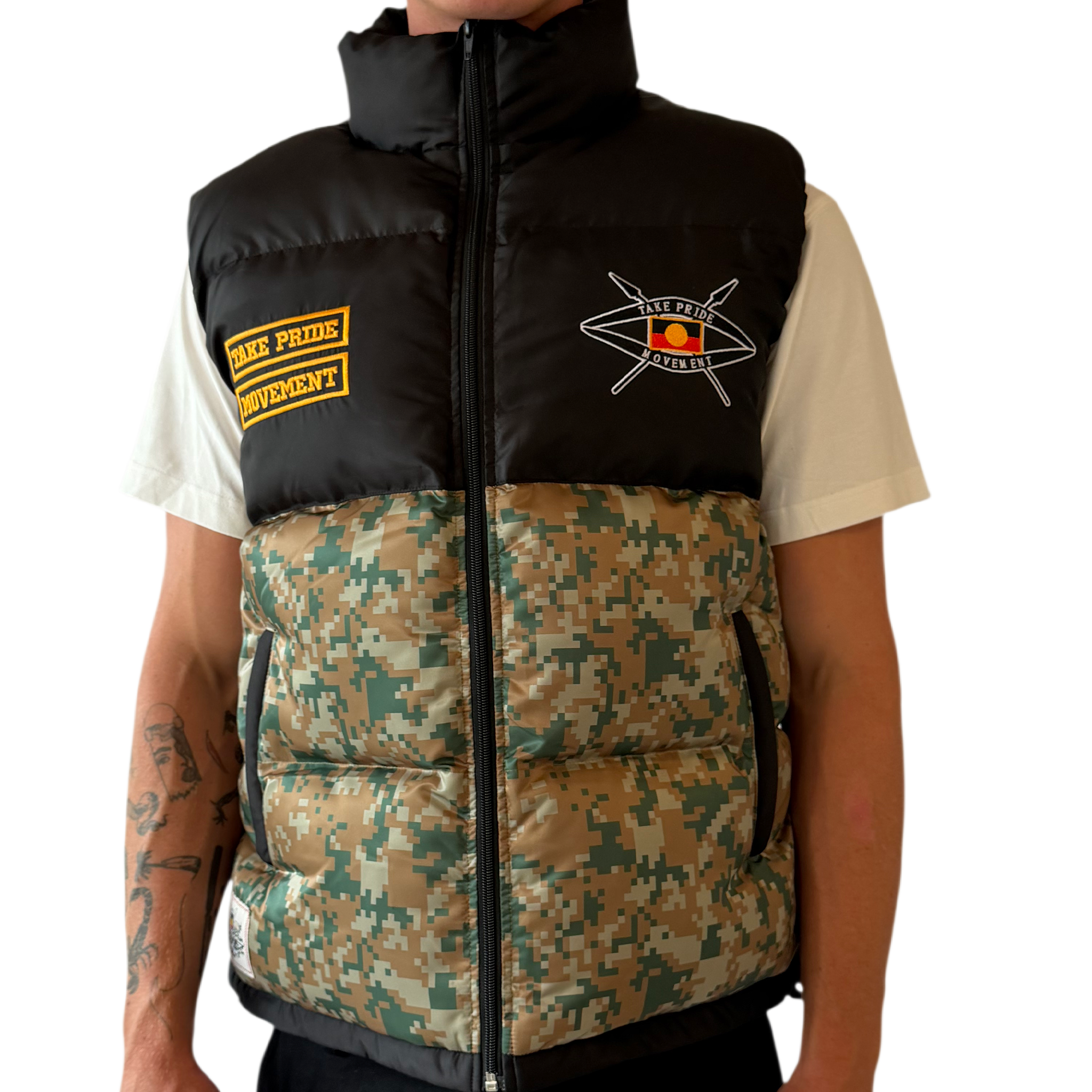 Underneath, crossed Aboriginal flags sitting strong across the camo panel.